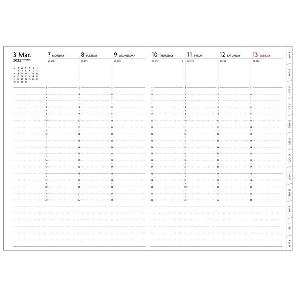 縦の時間軸で1日、1週間の仕事の流れが見える、月別インデックス付きの週間バーチカル手帳。