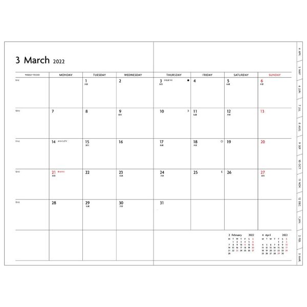 手帳本体 サイズ 手帳本体 仕様 本体サイズB6変型(180×120mm) ページ数224ページ 仕様糸かがり綴じ、切り込みインデックス付き 本文用紙オリジナル手帳用紙 NEO AGENDA(森林認証紙) 生産国日本製 レイアウト3月始まり/月曜始まり 月間ページブロックタイプ 週間ページバーチカルタイプ 月間ページ掲載期間2022年3月〜2023年4月 週間ページ掲載期間2022年2月28日〜2023年4月2日 掲載内容 月間ページ大安・仏滅・友引表示、ムーンカレンダー表示、ウィークナンバー 週間ページバーチカル18時間表記、ムーンカレンダー表示、ウィークナンバー、デイナンバー その他2022/2023/2024見開きカレンダー、年間カレンダー、年間プラン、月間プラン、罫線メモ16ページ、アドレス1ページ、パーソナルデータ 巻末情報 海外祝日一覧、世界地図/時差表、国内9都市地下鉄路線図