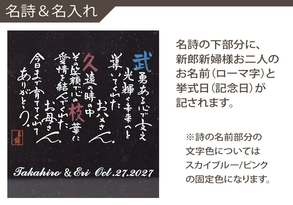 ・書体、文字色、詩の内容はおまかせとなり、ご指定、事前のご確認はできませんので、その旨ご了承下さい。